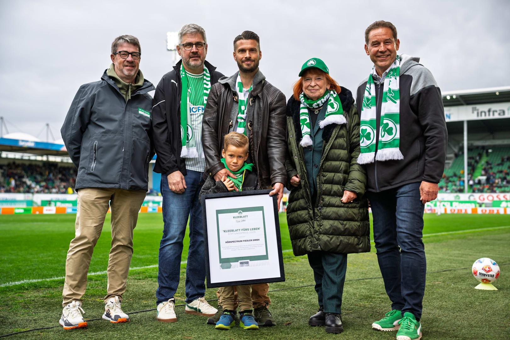 Die offizielle Übergabe des Stiftungspreises erfolgte im Rahmen des Heimspiels gegen den SV Darmstadt 98 im Sportpark Ronhof | Thomas Sommer. Die Mitglieder des Stiftungsrats der Stiftung Kleeblatt fürs Leben – Ingrid Hofmann, Markus Braun und Rolf Bidner – sowie Klaus Schardt als Vertreter des Business Fanklubs Kleeblatt Fürth überreichten die Urkunde an André Fiedler, Geschäftsführer der HÖRSPECTRUM FIEDLER GmbH.